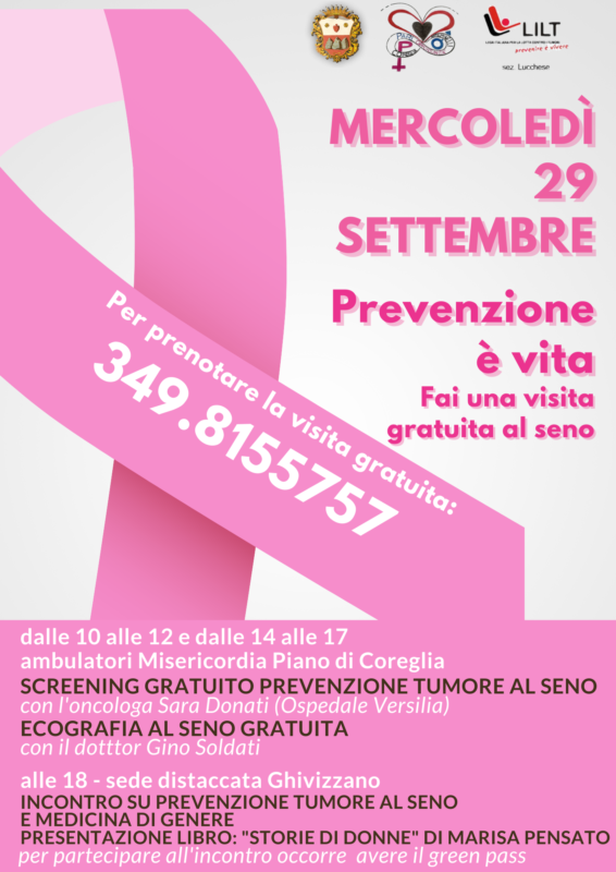 COREGLIA – “Prevenzione è vita”, questo il titolo dell’iniziativa, promossa dal Comune di Coreglia con la Commissione comunale pari opportunità e la sezione lucchese della Lilt, che mercoledì 29 settembre sarà organizzata a Piano di Coreglia, negli ambulatori della Misericordia. Un’intera giornata di visite gratuite al seno, come iniziativa concreta di sensibilizzazione e prevenzione. L’appuntamento infatti vuole inaugurare la campagna del fiocco rosa 2021 che sarà attiva per tutto il mese di ottobre con l’obiettivo di sensibilizzare alla prevenzione contro il tumore al seno.