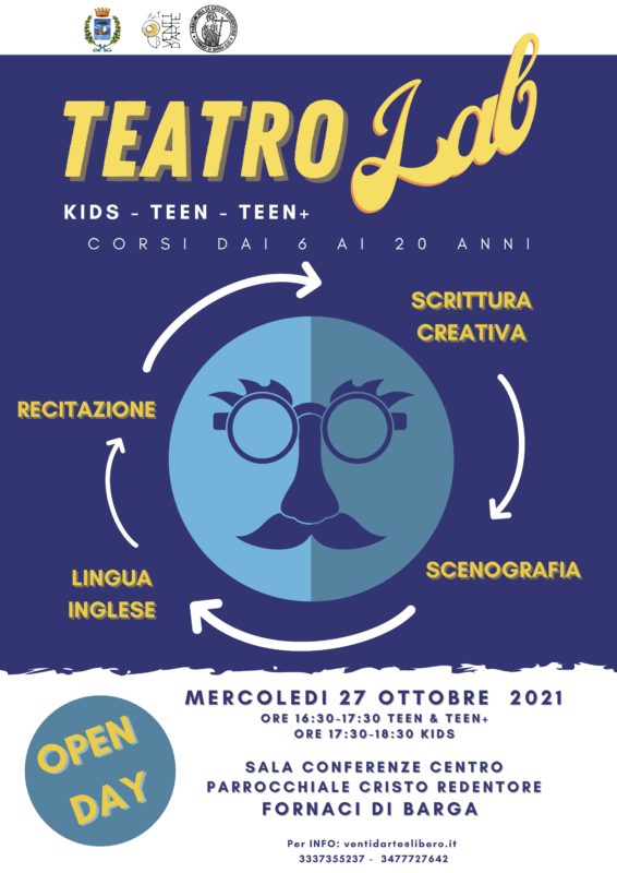 L’Open Day è previsto per mercoledì 27 ottobre: dalle ore 16.30 alle 17.30 la giornata aperta si rivolgerà alle fasce Teen (12-14 anni) e Teen+ (15-20 anni); dalle ore 17.30 alle 18.30 invece per la fascia Kids (6-11 anni). L’appuntamento è presso la Sala conferenze alla Parrocchia di Fornaci di Barga dove sarà possibile avere un assaggio di quanto sarà fatto durante il percorso, conoscere gli insegnanti e avere tutte le informazioni sui laboratori teatrali.