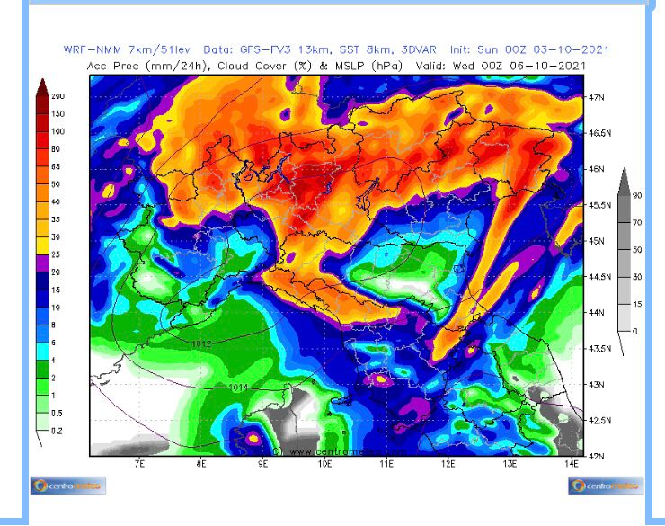 Ci diamo appuntamento a domani mattina per un ulteriore analisi della situazione; la cosa certa è che tra la serata odierna e mercoledì cadrà molta, moltissima pioggia con cumulate finali sull’intero periodo che potranno avvicinare, se non superare, anche i 200 mm sulle zone più esposte