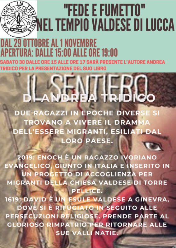 LUCCA – Torna l’appuntamento con “Fede e Fumetto” nel tempio valdese di Lucca, in via Galli Tassi 50. Come è ormai consuetudine, negli stessi giorni di Lucca Comics & Games, dal 29 ottobre al 1° novembre, il tempio valdese ospita una mostra di fumetti, quest’anno dedicata all’albo “Il Sentiero”, graphic novel di Andrea Tridico (Round Robin Editrice). E’ la storia di due ragazzi che in epoche diverse (1619 l’uno, 2019 l’altro) si trovano a vivere il dramma dell’essere migranti, esiliati dal loro Paese.
