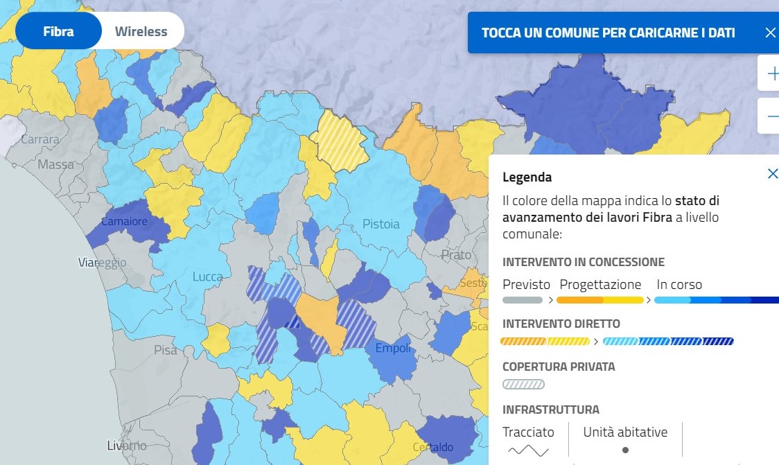 Un secondo servizio (https://bandaultralarga.italia.it/mappa/?entity=9) consente, invece, di monitorare lo stato di avanzamento ed il tracciato dei interventi di realizzazione della banda ultra-larga, già finanziati con fondi pubblici, ma solo in minima parte conclusi.