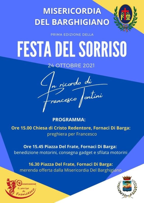 Sono tante le iniziative organizzate da due anni a questa parte in suo ricordo e la prossima sarà più che mai in suo nome ed in suo ricordo: la prima edizione della “Festa del Sorriso (in ricordo di Francesco)” organizzata il 24 ottobre prossimo a Fornaci dalla Misericordia del Barghigiano con la collaborazione dell’associazione Il sorriso di Francesco e del Comune di Barga oltre che del parroco di Fornaci don Giovanni Cartoni