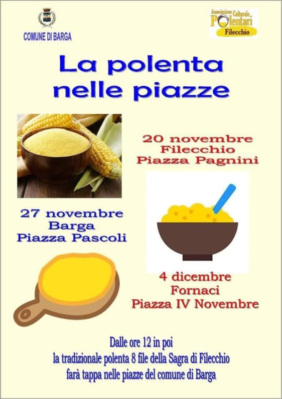 FILECCHIO – La polenta nelle piazze. Si chiama così il trittico di appuntamenti che i polentari di Filecchio proporranno, in collaborazione con il comune di Barga, nelle prossime settimane. Si comincia sabato 20 novembre in Piazza Pagnini e si va avanti il 27 novembre in piazza Pascoli a Barga, per concludere il 4 dicembre, in un sabato che preannunciamo fin molto intenso di attività di cui riparleremo, in piazza IV Novembre a Fornaci.