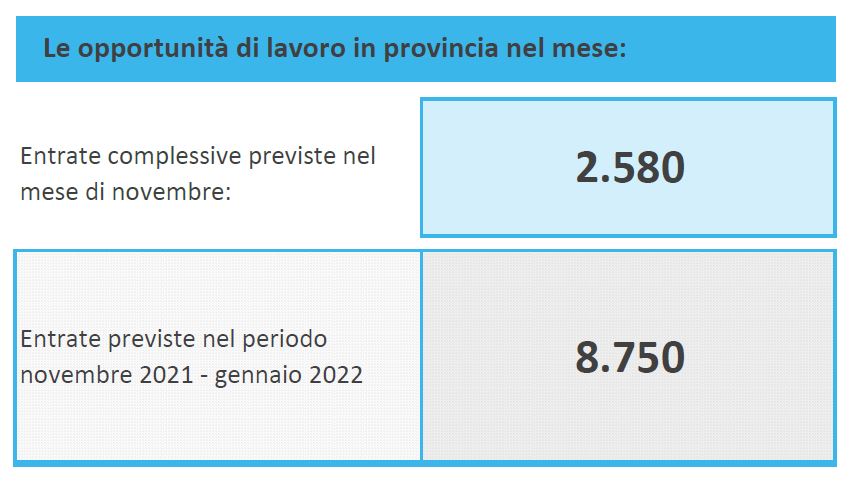 Il comparto industriale provinciale programma di effettuare 1.300 assunzioni nel mese di novembre e 4.020 nell’intero trimestre novembre 2021-gennaio 2022: nel dettaglio, per l’industria manifatturiera e public utilities la previsione è di 950 assunzioni a novembre e 2.970 nel trimestre, mentre per le costruzioni sono in programma 340 entrate a novembre e 1.050 nei tre mesi.