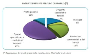 Le entrate previste si concentreranno per metà nel settore dell’industria (costruzioni incluse) e per il 76% nelle imprese con meno di 50 dipendenti. In 38 casi su 100 le imprese prevedono difficoltà nel reperimento dei profili professionali richiesti, pertanto la domanda di lavoro delle imprese potrebbe non venire del tutto soddisfatta.