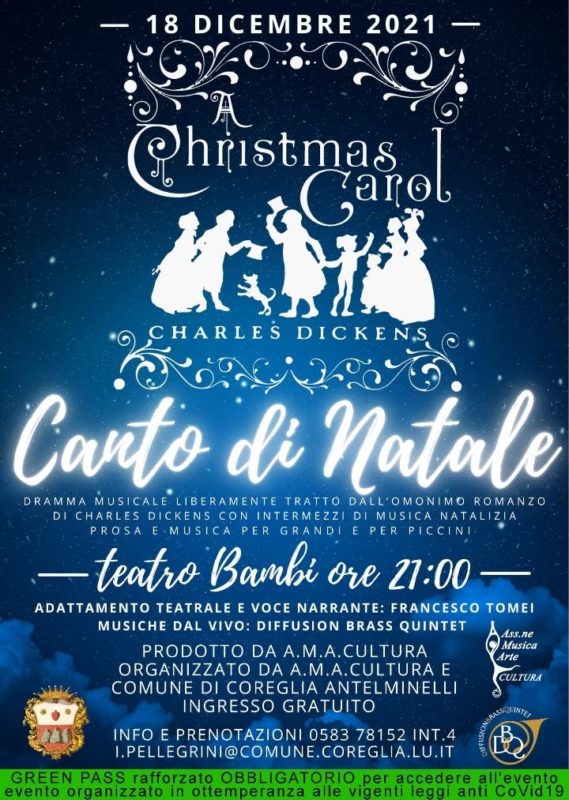 COREGLIA – A.M.A cultura Aps presenta il suo ultimo spettacolo dal titolo “Canto di Natale”, tratto dall’omonimo romanzo di Charles Dickens con l’adattamento teatrale di Francesco Tomei.
