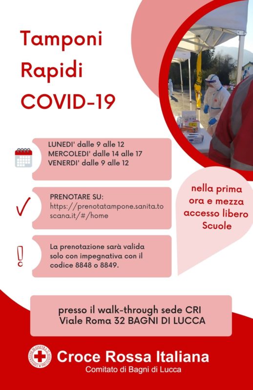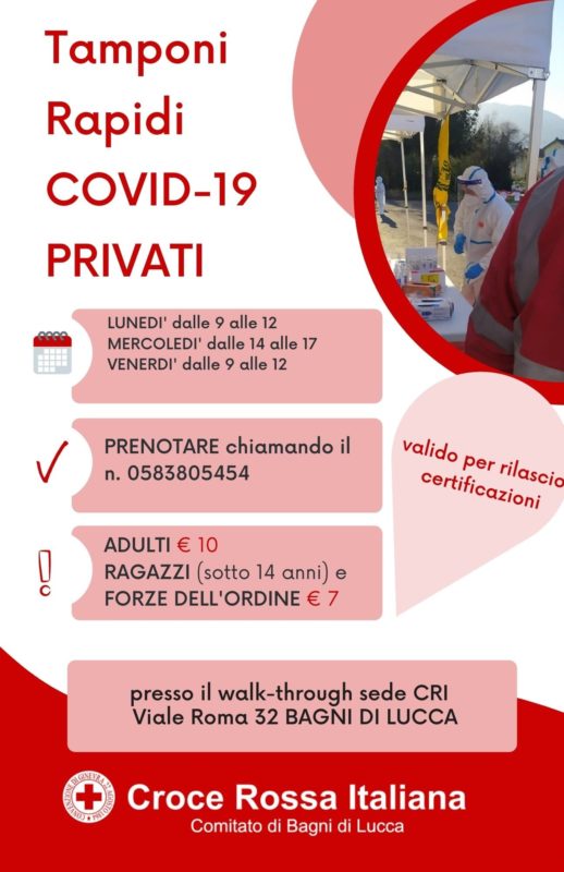Il Comitato CRI di Bagni di Lucca effettuerà il servizio di tamponi rapidi validi per il rilascio delle certificazioni, a chiunque ne faccia richiesta ed a prezzi calmierati. Anche i tamponi rapidi svolti privatamente saranno effettuabili presso il walk-trough di viale Roma nei soliti giorni ed orari.
