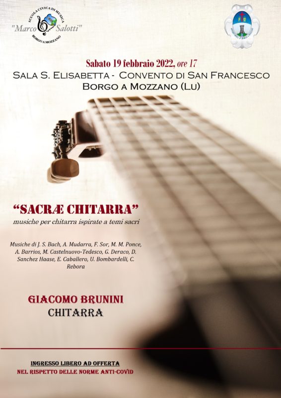 BORGO A MOZZANO – Si terrà questo sabato, alle ore 17, nella bellissima Sala Santa Elisabetta del Convento di San Francesco a Borgo a Mozzano il concerto del chitarrista Giacomo Brunini. L’evento dal titolo “Sacræ chitarra” proporrà al pubblico un programma musicale dedicato alle musiche per chitarra ispirate a temi sacri dal rinascimento fino ai nostri giorni con musiche di Bach, Mudarra, Sor, Tarrega, Ponce, Castelnuovo-Tedesco, Deraco, Rebora, Bombardelli, Sanchez Haase e Caballero.