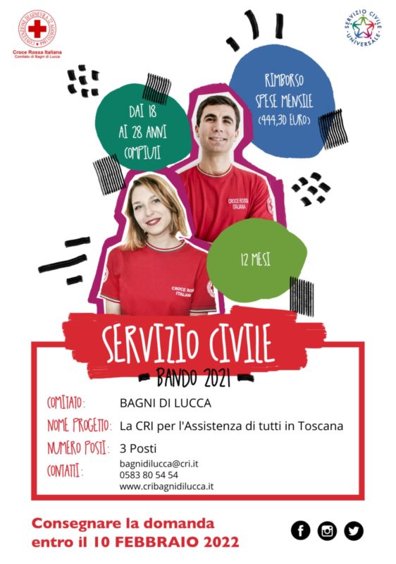BAGNI DI LUCCA – C’è tempo fino al 10 febbraio 2022 per presentare domanda, per svolgere il servizio civile universale presso il Comitato di Bagni di Lucca della Croce Rossa Italiana. I posti disponibili sono 3 e fanno parte del progetto “La CRI per l’assistenza di tutti in Toscana”.