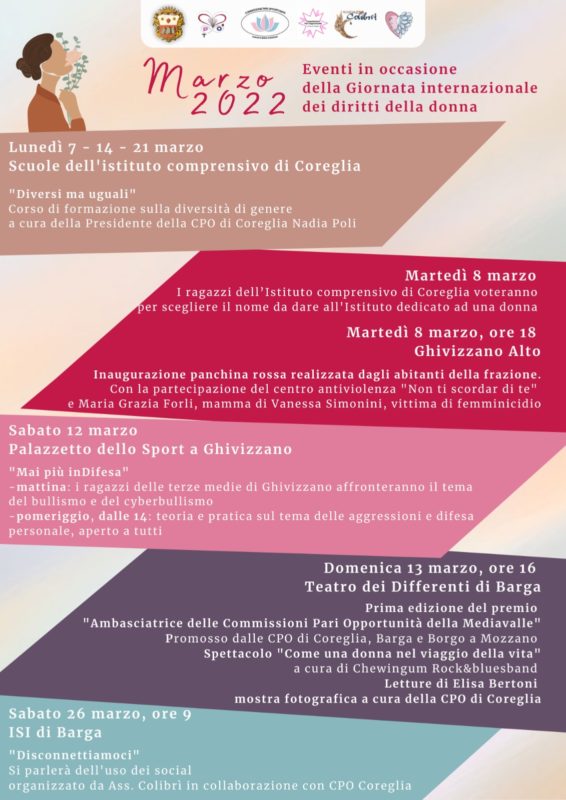 Un calendario molto fitto nato dalla collaborazione tra l’amministrazione comunale e le Commissioni delle Pari Opportunità (CPO) di Coreglia, Borgo a Mozzano e Barga insieme con le associazioni Colibrì e Non ti scordar di te.