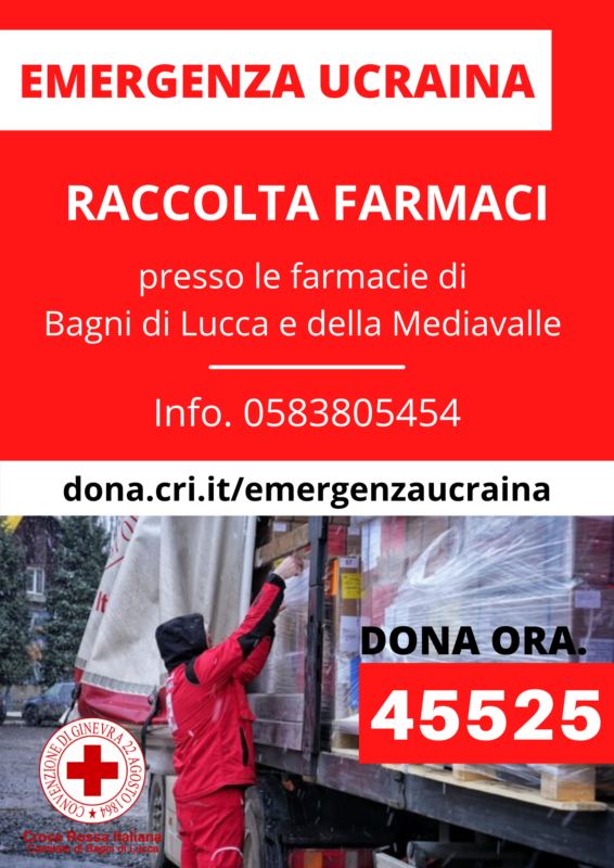 L’elenco dei medicinali e delle attrezzature richieste sarà possibile consultarlo anche presso le stesse farmacie. I farmaci saranno conservati dalle stesse Farmacie e ritirati nei prossimi giorni dalla CRI di Bagni di Lucca per essere inviati tramite i convogli organizzati dalla Croce Rossa Italiana in Ucraina.
