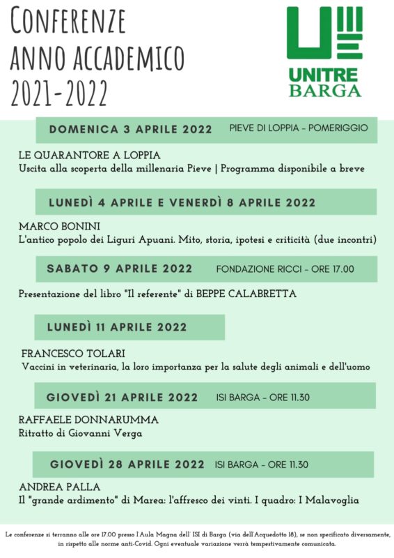 Intanto Unitre Barga presenta anche gli appuntamenti con le conferenze e le iniziative in programma nel mese di aprile. Si comincia domenica 3 aprile con la passeggiata culturale da Barga alla Pieve di Loppia, in occasione delle Quarantore. Lunedì 4 aprile alle 17, sempre presso l’aula magna Carradini Marco Bonini tratterà il tema “L’antico popolo dei Liguri Apuani. Mito, storia, ipotesi e criticità (due incontri). Sabato 9 aprile, questa volta alla Fondazione Ricci sempre alle 17 la presentazione del libro di Beppe Calabretta “Il Referente”. Lunedì 11 aprile, di nuovo all’Aula Magna alle 17, Francesco Tolari presenta la conferenza “Vaccini in veterinaria, la loro importanza per la salute degli animali e dell’uomo”.
