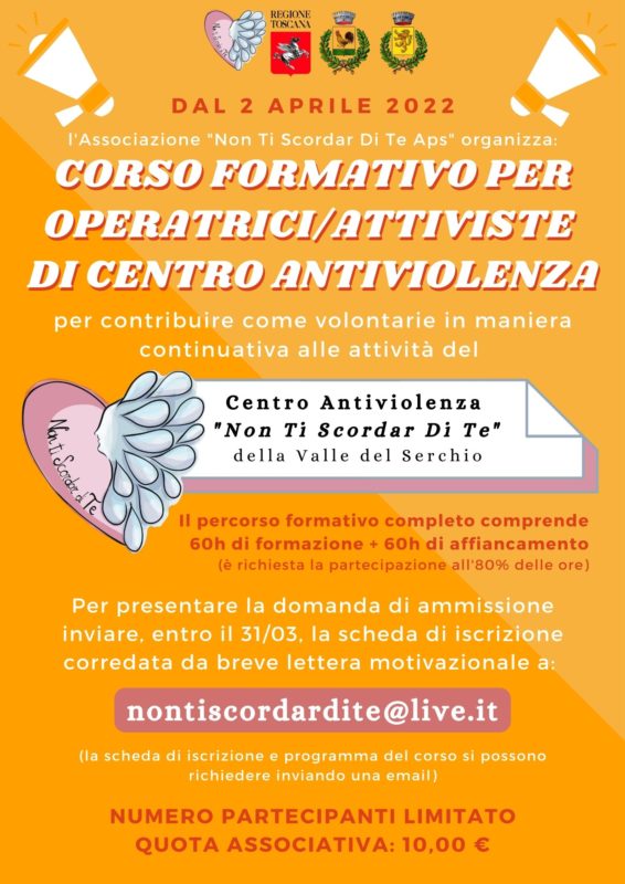 GALLICANO – L’Associazione “Non Ti Scordar Di Te Aps” organizza un corso di formazione per operatrici/attiviste di Centro Antiviolenza, rivolto a donne motivate per contribuire come volontarie in maniera continuativa alle attività del Centro Antiviolenza “Non Ti Scordar Di Te” della Valle del Serchio che ha sede a Ponte di Campia (Gallicano) e Castelnuovo.