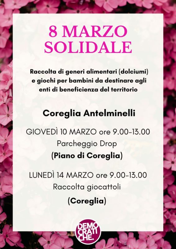 COREGLIA – In occasione della Giornata internazionale della donna la Conferenza delle Donne Democratiche lucchese ha in programma una serie di iniziative sui territori per un “8 marzo solidale”, volte a raccogliere beni da destinare alle associazioni che operano a sostegno delle donne e ad enti di beneficenza.