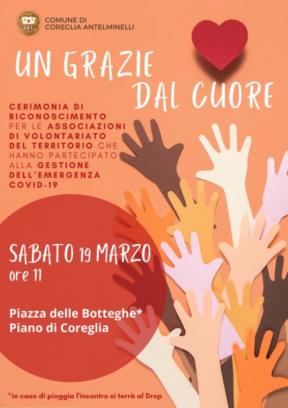 PIANO DI COREGLIA – Il Comune di Coreglia organizza “Un grazie dal cuore”, una cerimonia di riconoscimento per le associazioni di volontariato del territorio che hanno partecipato alla gestione dell’emergenza covid-19.