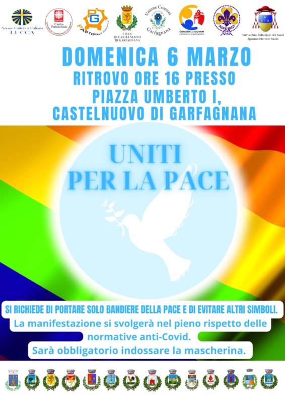D’intesa con gli attori sociali del territorio, la manifestazione si terrà Domenica 6 Marzo p.v. con ritrovo a partire dalle ore 16.00 in p.zza Umberto I a Castelnuovo di Garfagnana, al fine di promuovere sentimenti di pace e solidarietà verso il popolo ucraino, condannando ogni forma di violenza e di ricorso all’uso delle armi.