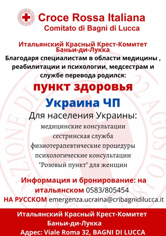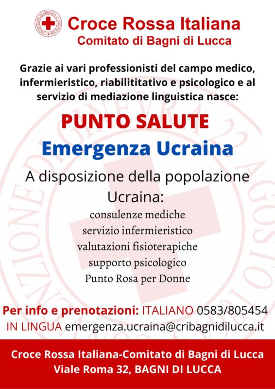 BAGNI DI LUCCA – Emergenza Ucraina. Il Comitato di Bagni di Lucca della Croce Rossa Italiana, grazie ai vari professionisti di campo medico, infermieristico, riabilitativo e psicologico che si sono messi a disposizione quali volontari temporanei e al servizio di mediazione linguistica, ha istituito un PUNTO SALUTE presso l’ambulatorio della sede CRI di Bagni di Lucca, a disposizione della popolazione ucraina presente sul territorio della Valle del Serchio e della Val di Lima.