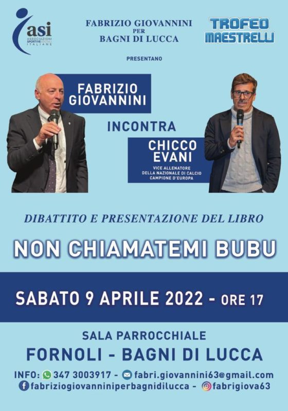 L’ente di promozione sportiva ASI di Lucca ha organizzato per sabato un incontro a Bagni di Lucca dove Chicco Evani presenterà il suo nuovo libro “Non chiamatemi Bubu”. A intervistarlo sarà il neo eletto presidente provinciale Fabrizio Giovannini.