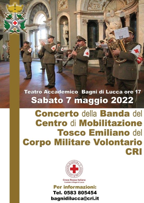 BAGNI DI LUCCA – Sarà il Teatro Accademico di Bagni di Lucca che sabato 7 maggio alle ore 17 ospiterà la Banda del Centro di Mobilitazione Tosco Emiliano del Corpo Militare Volontario CRI che terrà un concerto pubblico (INGRESSO LIBERO), diretto dal maestro Tenente Mauro Rosi. Un grande evento, per Bagni di Lucca e tutta la Media Valle.