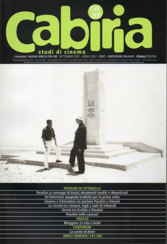 Pier Paolo Pasolini è stato il primo letterato italiano a esprimersi compiutamente anche nel cinema, non come una seconda professione (si veda il caso di Mario Soldati) o come esperimento saltuario (Moravia), ma come scelta di un linguaggio diverso dalla poesia, dal saggio e dal romanzo, mirato a integrarli, essendo parte essenziale e inscindibile della sua opera. Durante la serata Marco Vanelli affronterà principalmente il percorso che ha portato Pasolini a realizzare Il Vangelo secondo Matteo (1964), con le sue particolari scelte stilistiche, visive e sonore. Le ricerche che lo stesso Vanelli ha condotto insieme a Giovanni Ricci ad Assisi, presso la Cittadella, dove Pasolini soggiornò a più riprese e dove nacque e si sviluppò l’idea del film, sono confluite nell’ultimo numero della rivista Cabiria – Studi di Cinema, di cui è direttore.