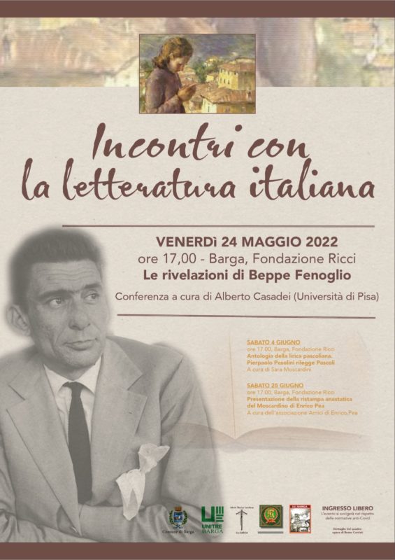 Martedì 24 alle ore 17., sempre alla Fondazione Ricci, il prof. Alberto Casadei (Università di Pisa) terrà la conferenza “Le rivelazioni di Beppe Fenoglio”, il grande autore della Resistenza di cui ricorre quest’anno il centenario della nascita.