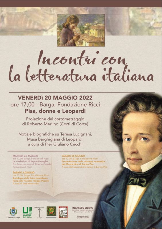 Venerdì 20 alle ore 17 alla Fondazione Ricci ci sarà la proiezione del video del dr. Roberto Merlino “Pisa, donne e Leopardi” alla presenza dell’autore. Nell’occasione Pier Giuliano Cecchi parlerà della protagonista del video, Teresa Lucignani, la barghigiana che Leopardi conobbe a Pisa e che divenne una dea della sua poesia.