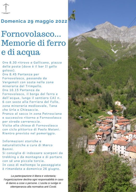 Domenica 29a sezione organizza invece una gita alla scoperta delle antiche ferriere di Fornovolasco, con la guida di Marco Bonini. Partenza ore 8.30 da Gallicano, dal piazzale antistante il Gallo Goloso. Si raccomanda come sempre l’utilizzo di calzature adatte.