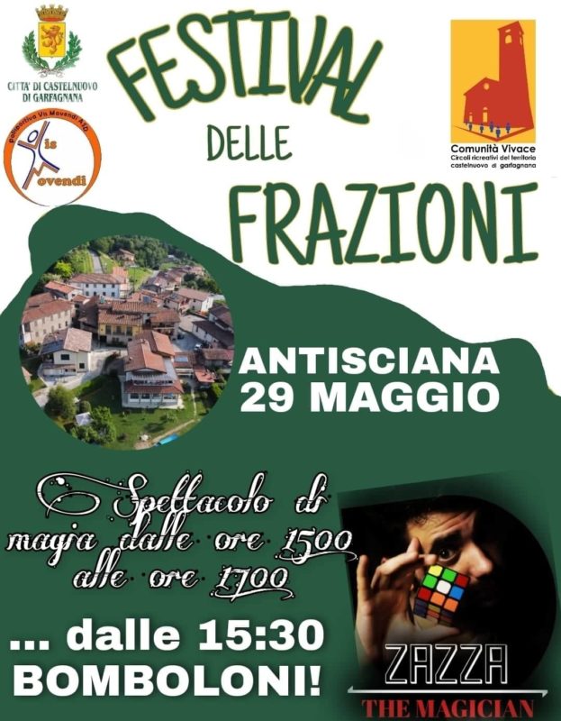 Antisciana aprirà la propria tappa del il Festival con un pranzo tipico e proseguirà per tutta la giornata con la merenda ed un mini mercato di artigianato e prodotti del territorio (chi volesse prenotare il pranzo può chiamare Giacomo 328 1388202). Alle 15:30 è previsto uno show del Mago Zazza adatto a grandi e piccini. Nel pomeriggio sarà poi inaugurata la biblioteca diffusa, un progetto della Biblioteca comunale di Castelnuovo che promuove il book crossing .