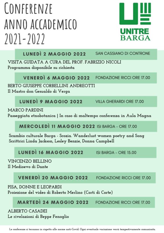 BARGA – Unitre Barga propone anche per il mese di maggio un bel programma di conferenze.