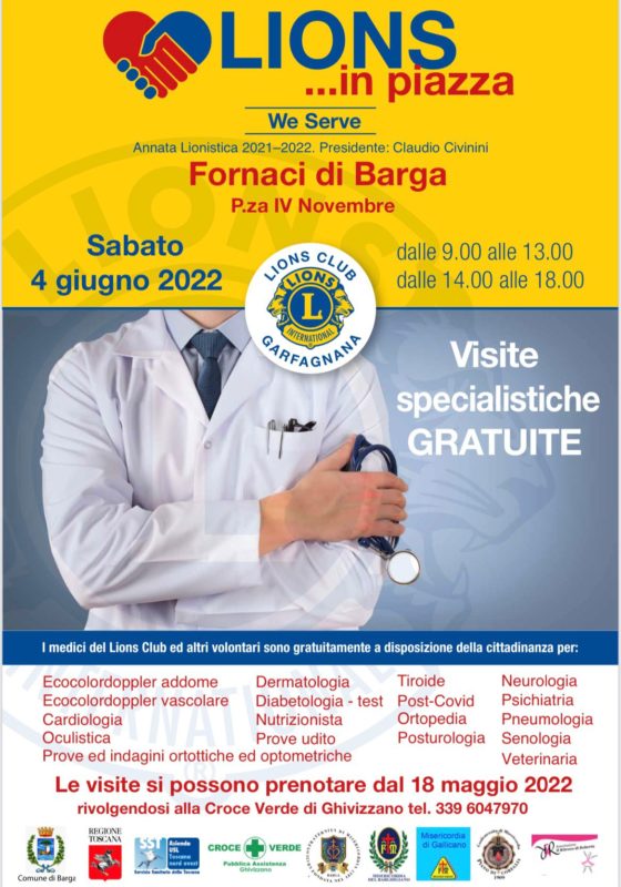 FORNACI – Torna a Fornaci di Barga, sabato 4 giugno, organizzata dal Lions Club Garfagnana “Lions in piazza”. Visite mediche ed esami completamente gratuiti che sarà possibile effettuare negli stand allestiti appositamente. L’appuntamento si terrà in Piazza IV Novembre