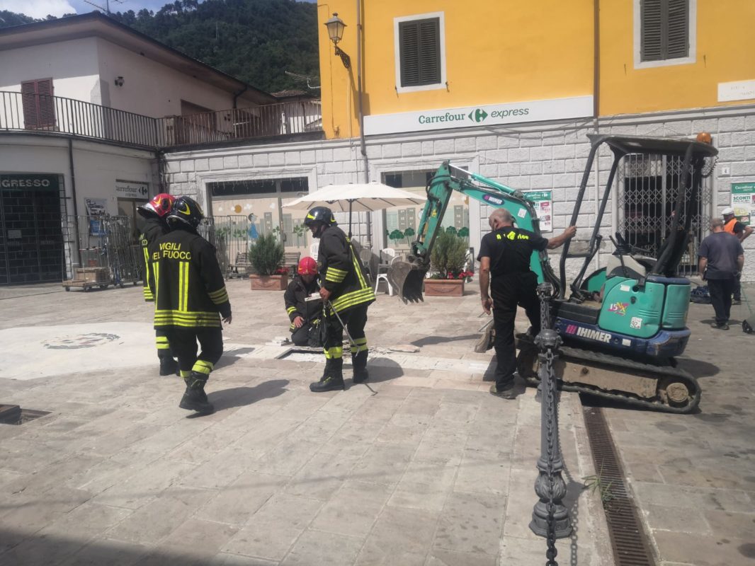 Già nella mattinata nella piazza c’erano stati alcuni movimenti anomali, ma nel corso delle ore la situazione si è aggravata con evidenti rigonfiamenti della piazza in un paio di punti; si è temuto per la rottura di un tubo dell’acqua, ma soprattutto, tra le altre uipoitesi, per una possibile e pericolosa fuga di gas e per tal motivo dopo i primi rilievi dei tecnici del comune è stato richiesto l’intervento dei Vigili del Fuoco che arrivati sul posto hanno iniziato la rimozione del pavimento in marmo realizzato vent’anni fa da Gilberto Malerbi.