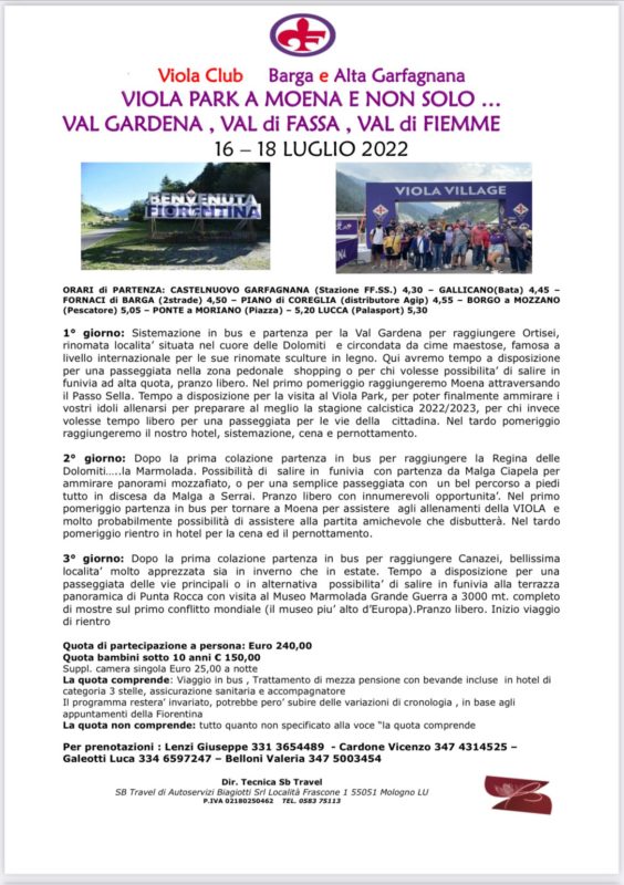 BARGA – Il Viola Club Barga e Alta Garfagnana organizza dal 16 al 18 luglio una gita al Viola Park di Moena in occasione del ritiro della Fiorentina. Sarà- anche l’occasione per visitare la Val Gardena, la Val di Fassa e la Val di Fiemme.