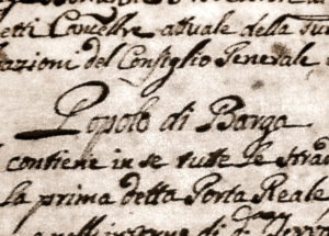 Parrebbe allora che in questa singolare ottica che abbiamo posto in evidenza, derivi come una sorta di genesi, una consuetudine locale, cioè, una caratteristica legata al suo antico modo di applicare le tasse, ossia, che nella Terra di Barga (l’interno del Castello), tutto ciò che stava dentro il perimetro delle mura, non era censito a estimo con fini fiscali. Questo nei primi estimi conosciuti della Comunità, cioè, a differenza di ogni cosa che stava fuori da esse, tutto quello che era dentro non era soggetto a tassazione. Di là da questa particolare e assai singolare situazione di Barga, l’assenza di un castellano censimento di fatto priva lo studioso di quei dati che, tratti dagli estimi, sarebbero molto utili per ricostruire la storia delle famiglie e le relative possessioni dei palazzi ma ora stiamo trattando un altro argomento e allora torniamo al nostro Campione delle strade.