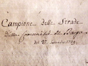 Campione o Registro delle strade della Comunità di Barga del 27 settembre 1779, è un quaderno segnato con un n. 55, di complessive dieci pagine scritte con una buona calligrafia, dove si ha l’occasione di poter leggere, tutte le strade principali che graficamente segnavano un’ipotetica cartina dell’allora Territorio o Vicariato della stessa Barga, mappa virtuale, perché dentro, sono elencate e descritte, però non raffigurate con disegni. Autore il perito comunale Francesco Merrighi del popolo di Loppia che non solo dà in questo elenco, attuato nel precedente 1778, la ricognizione delle vie, ma informa un poco l’allora lettore su alcune specificità del territorio.