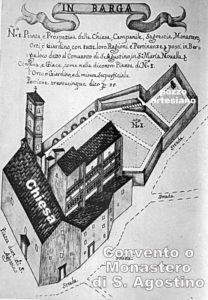 Dell’altra chiesa degli Agostiniani possiamo far vedere qualcosa e questo si deve al disegno che il mio antenato Domenico Cecchi di Castiglione Lucchese fece al convento Sant’Agostino, quando nel 1741 fu richiesta dai Frati la sua opera di tecnico per redigere il campione con mappe dei beni da loro posseduti. Questi frati, come recita il lavoro di Cecchi, erano operanti nel territorio di Barga sin dal 1077, con due eremi che si scambiavano vicendevolmente di che vivere: Sant’Ansano a Giuncheto e Santa Margherita a Sommocolonia, poi, pare che con l’anno 1360 entrassero nella Terra di Barga, stabilendosi nel mezzo del Castello.