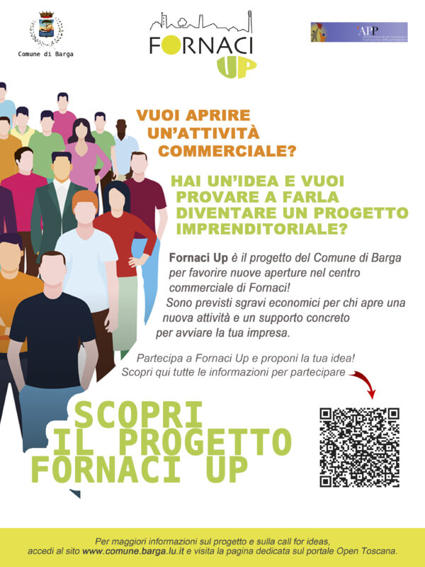 Proponi la tua idea a Fornaci Up, il progetto del Comune di Barga per favorire nuove aperture nel centro commerciale di Fornaci! Sono previsti sgravi economici per chi apre una nuova attività e un supporto concreto per avviare il progetto.