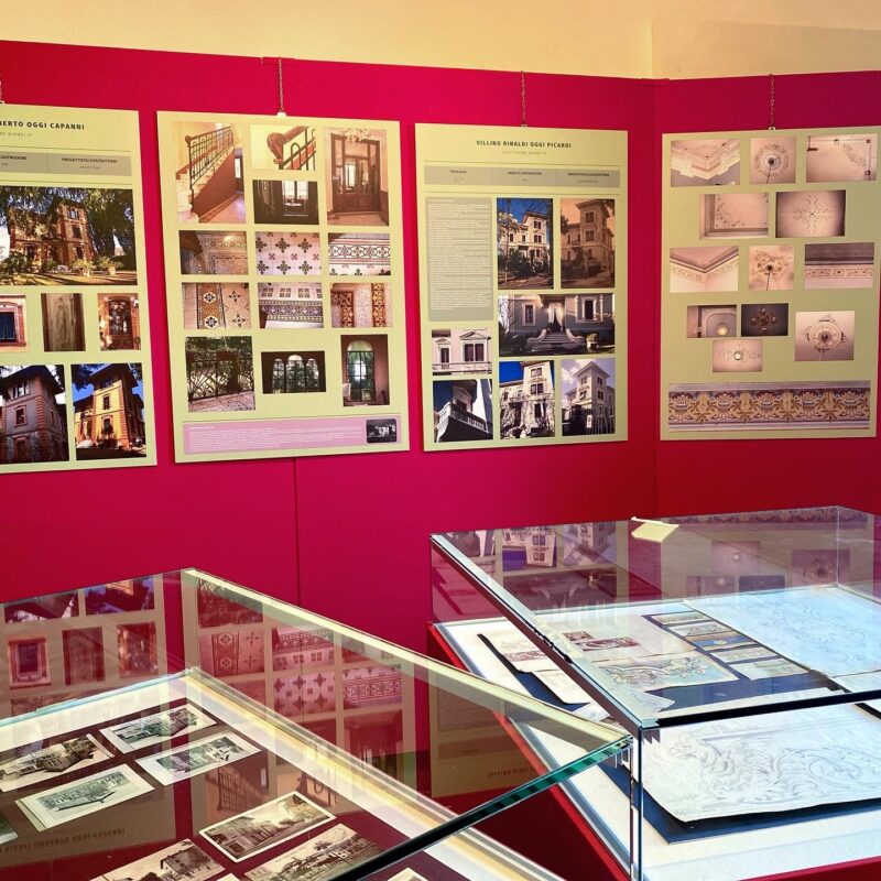 Il tessuto urbano del periodo documentato in mostra si arricchisce così di: un villino della famiglia Pieroni (due nel Canteo e uno all’Arsenale – San Pietro in campo) dei 3 storicamente di proprietà della famiglia che migrò a Boston per vendere figurine di gesso per poi sviluppare un grande business nel campo della ristorazione, e che completano la visuale sul suo ruolo nella trasformazione del tessuto urbano della città dell’epoca; casa Pascoli, preesistente ma trasformata proprio e ampliata nell’arco temporale interessato dalla mostra, con un primo ampliamento voluto dal poeta detto “il colosseo”, che nelle sue intenzioni doveva servire a trasformare la proprietà in un una piccola azienda agricola, e l’altana: dopo il terremoto del 1920 fu necessario mettere delle catene di ancoraggio e negli anni successivi furono realizzate per volontà del poeta, scomparso nel 1912, le bifore (i pannelli illustrano in particolare gli interni e gli arredi, le lampade, le decorazioni); villa “Il Nido”, progettata dal geometra Giuseppe Santini, autore degli edifici più eclettici della città: si tratta di un’architettura ispirata allo stile bretone e gli eredi hanno consentito la consultazione dei materiali dello studio del progettista permettendo di ritrovare i cataloghi sui quali si è ispirato in particolare per l’apertura circolare, unica a Barga, dell’edificio in zona Giardino.