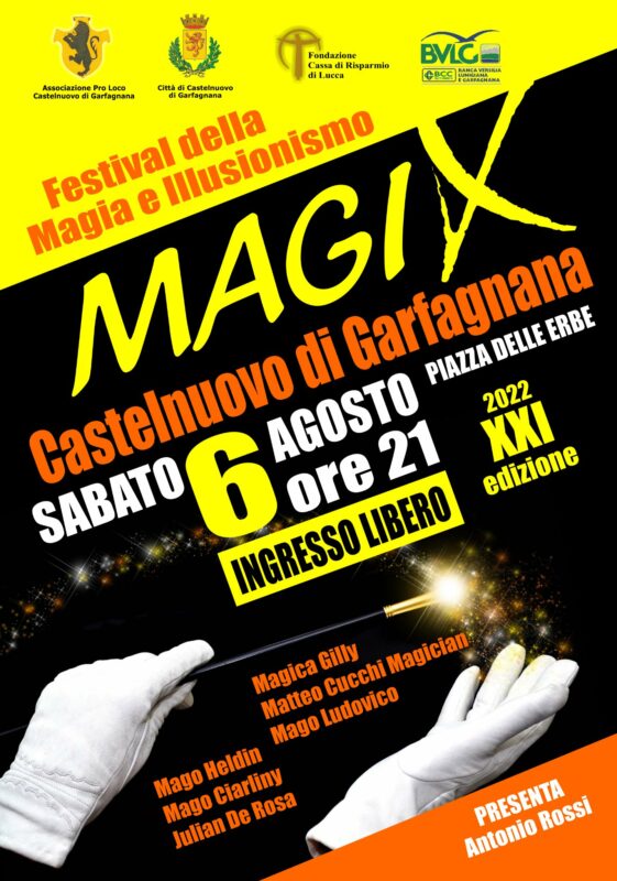CASTELNUOVO – Sabato 6 agosto alle 21 in Piazza delle Erbe a Castelnuovo di Garfagnana si rinnova l’appuntamento con MagiX, rassegna di magia e illusionismo giunta quest’anno alla XXI Edizione.