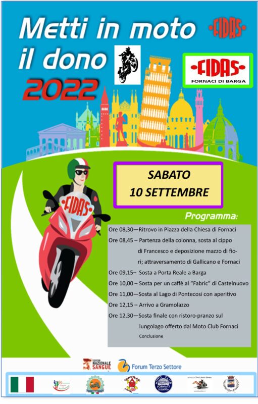 FORNACI – Per far fronte alle aumentate richieste di plasma e sangue e allo scopo di incrementarne la donazione, il gruppo Donatori di Sangue FIDAS di Fornaci di Barga organizza per sabato 10 settembre una passeggiata in moto nella Valle del Serchio denominata “Metti in Moto il Dono”. Questa iniziativa prende spunto dalla campagna nazionale della FIDAS che si rivolge a tutte le federate FIDAS Italiane che abbiano passione per le due ruote, oltreché sensibilità alla donazione del sangue. Una ventina di gruppi in tutta Italia stanno organizzando la propria manifestazione e così sarà anche a Fornaci.