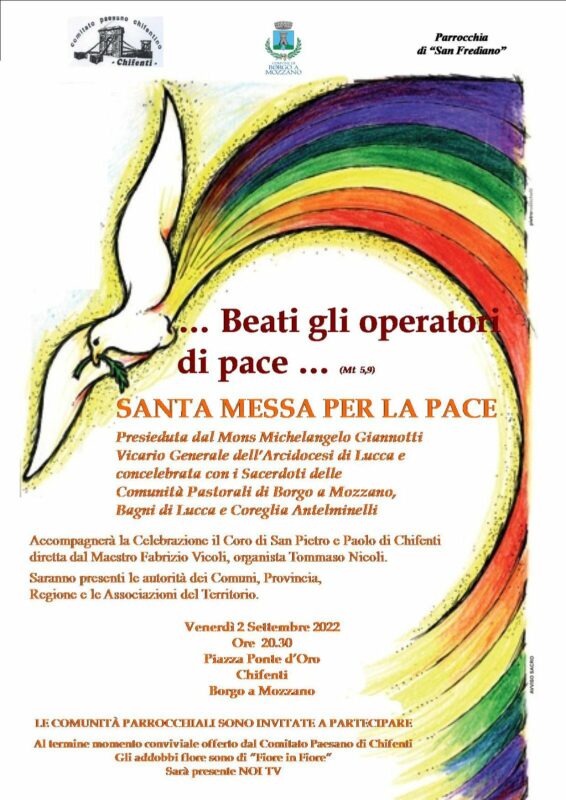 Appuntamento ricco di grande profondità e significato, soprattutto in questo difficile periodo di guerra, quello che verrà organizzato a Chifenti, in piazza Ponte d’Oro, il prossimo 2 settembre alle 20,30. Qui verrà celebrata la “Santa Messa per la Pace”, una manifestazione per la pace promossa dal Comitato paesano di Chifenti, dalla Parrocchia di Chifenti, con il patrocinio del Comune di Borgo a Mozzano,.
