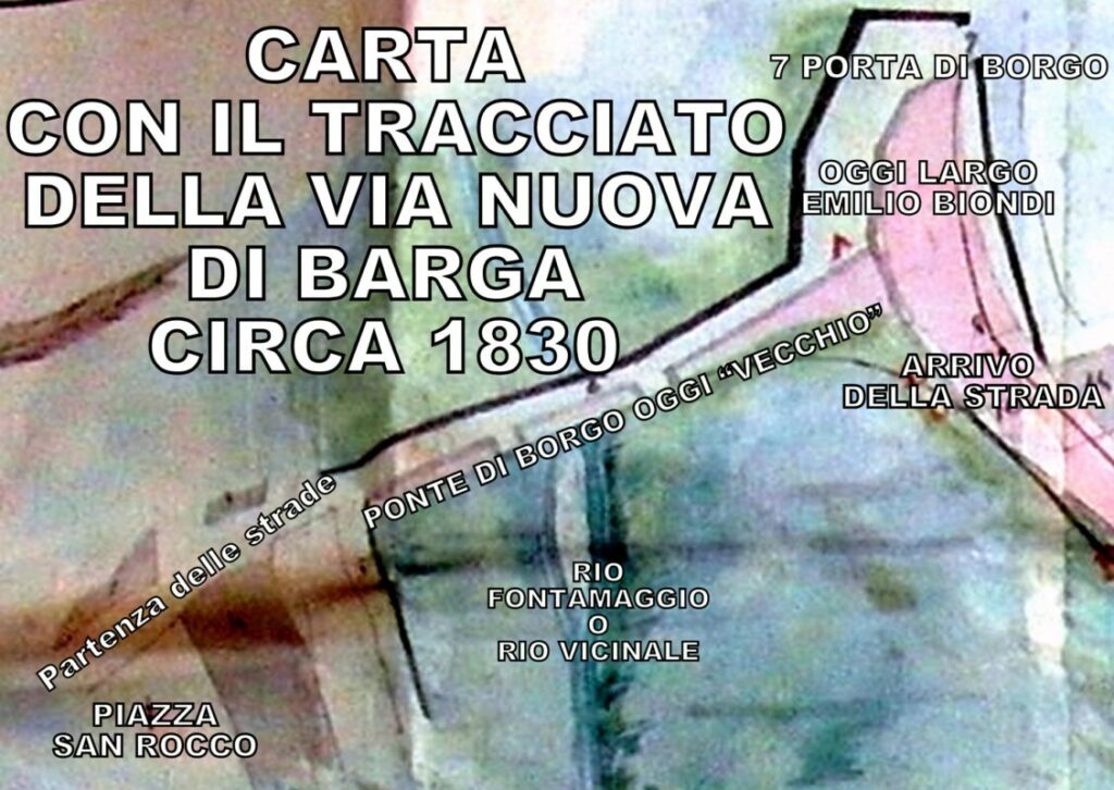 La partenza di questa strada è simile alle altre già esaminate, una per San Pietro in Campo, l’altra per Castelvecchio, con la sola differenza che ora, usciti dal Ponte di Borgo, oggi detto Vecchio, si prendeva da un’altra parte, ossia, arrivando in faccia all’ignota casa Vannucci, si andava a destra. Così, attraversando il Giardino, si arrivava sino alla casa di Giuseppe Chiappa, dove, si lasciava a destra la strada che sboccava di fronte al portone del Sig. Marchese de Angeli, oggi il Cancellone di Villa Gherardi.