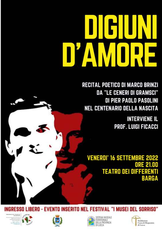 BARGA – La Provincia di Lucca assieme a “Festival Musei del Sorriso” partecipano alle celebrazioni nazionali per il centenario della nascita di Pier Paolo Pasolini, con DIGIUNI D’AMORE recital poetico di Marco Brinzi a cura di Luigi Ficacci.