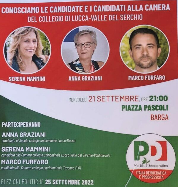 BARGA – Mercoledì 21 alle ore 21 in piazza Pascoli a Barga l’Unione Comunale del PD di Barga organizza un incontro pubblico in cui saranno ospiti i candidati PD al Parlamento:  Serena Mammini;  Marco Furfaro; Anna Graziani. La cittadinanza è invitata a partecipare