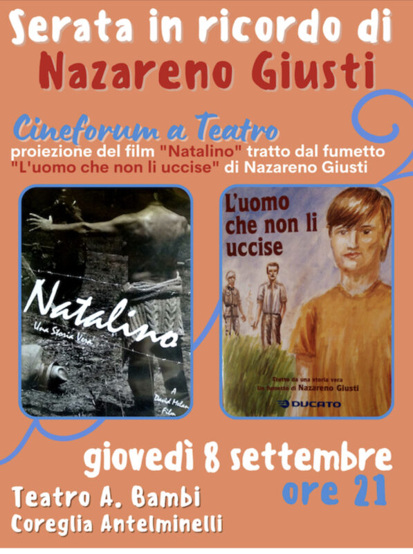 Giovedì 8, alle 21, al teatro “A. Bambi” sarà proiettato il film “Natalino” di David Melani, giovane regista di Ghivizzano, tratto proprio da uno dei fumetti del giovane Giusti, “L’uomo che non li uccise” (Ducato, 2007), disegnato all’età di 17 anni e per il quale ha ricevuto il Premio “Territorio e Libertà”.