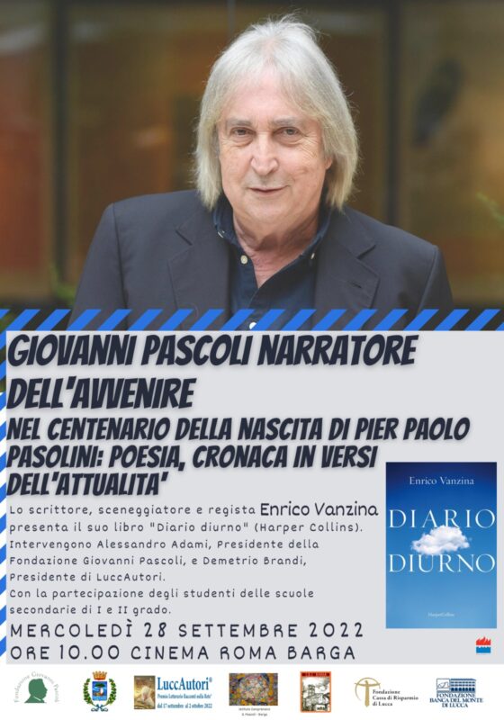 Mercoledì 28 settembre sarà a Barga un ospite di eccezione: il regista Enrico Vanzina. L’incontro, organizzato in collaborazione con gli istituti di istruzione di Barga, è compreso nel festival LuccAutori ed è aperto al pubblico. Alle 10.30 al Cinema Roma di Barga Vanzina parlerà di Pascoli nel centenario della nascita di Pier Paolo Pasolini. Introdotto da Alessandro Adami, presidente della Fondazione Pascoli e da Demetrio Brandi, presidente di LuccAutori, Vanzina nell’occasione presenterà il suo libro “Diario diurno” (Harpers&Collins), vincitore del Premio Letterario Internazionale Casinò di Sanremo 2022.