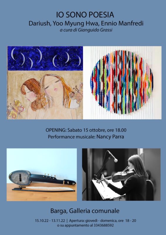 Sabato 15 ottobre inaugura “Io sono poesia” con le opere di tre interessanti e notevoli artisti: Dariush, Yoo Myung Hwa, Ennio Manfredi.