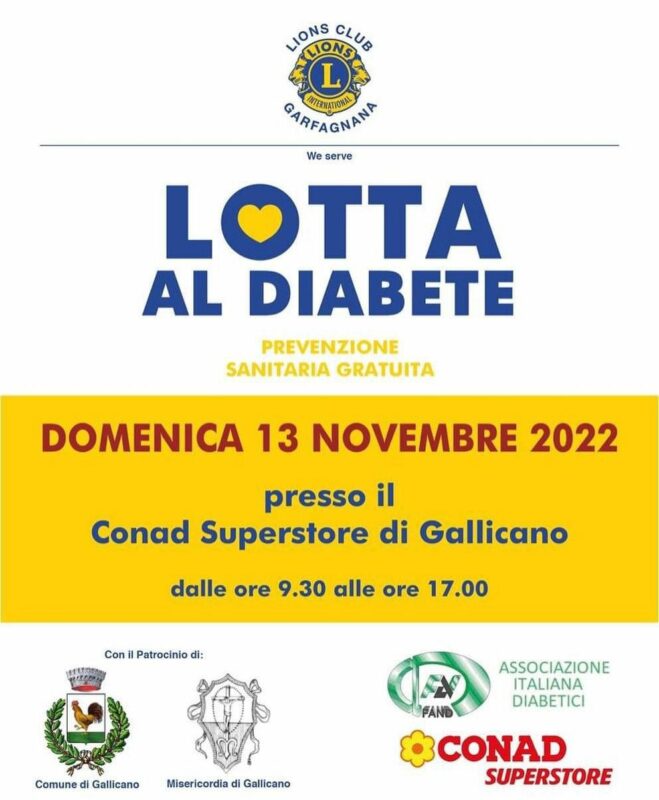 GALLICANO – Il giorno 14 novembre è la giornata mondiale del Diabete, e per questo evento domenica 13, presso la Conad di Gallicano, il Lions Club Garfagnana sarà presente per effettuare uno screening gratuito sul Diabete Mellito di tipo 2, con medici che daranno consigli su uno stile di vita adeguato per non incorrere in questo tipo di patologia.