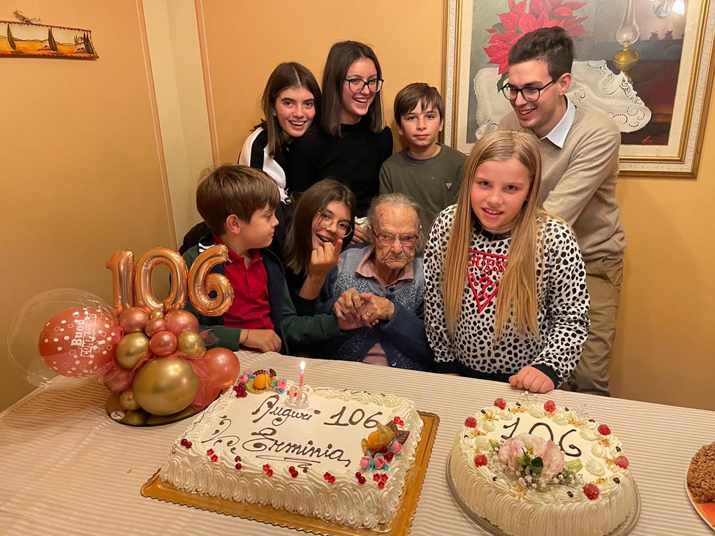 CASTELVECCHIO PASCOLI – Nasceva il 13 novembre di 106 anni fa nel comune di Castiglione di Garfagnana, a Chiozza, loc. Stefanelli, Erminia Rossi.  A festeggiarla  a Castelvecchio Pascoli, dove Erminia vive con la figlia Maria Assunta Rossi, i figli Maria, Giordano e Battista, i nipoti e gli 8 pronipoti.