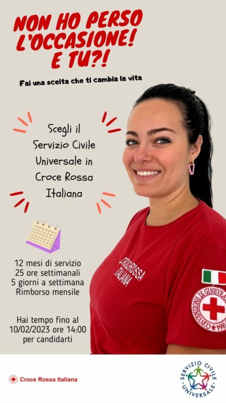 Il Servizio Civile Universale rappresenta un’occasione di crescita per tutti i giovani che decidono di dedicare un anno delle loro vite al Servizio della comunità. Il bando per la partecipazione al servizio civile in Croce Rossa scade alle ore 14.00 di venerdì 10 febbraio 2023. Per avere tutte le informazioni del caso si può consultare il sito: