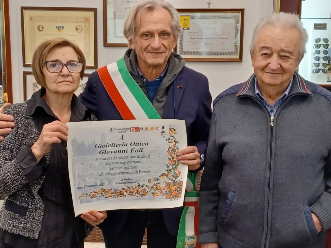 FORNACI – Sono sessanta gli anni di attività di un’azienda di Fornaci che indubbiamente ha scritto in questi decenni parte della storia del commercio nella cittadina, nel comune e della Valle del Serchio. Stiamo parlano della Gioielleria Ottica Giovanni Foli, che nei giorni scorsi ha festeggiato questo bel traguardo. Per l’occasione in negozio è arrivato anche per il comune di Barga l’assessore Lorenzo Tonini che ha speso belle e sincere parole per questa attività, consegnando una pergamena quale segno di riconoscimento e di ringraziamento dell’Amministrazione Comunale per quanto fatto in questi anni, per il tessuto commerciale di Fornaci e non solo, da questa realtà.